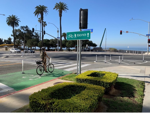 The protect bicycle intersection is a key feature of the Ocean Avenue project that installed a two-way parking-protected bikeway on the west-side of Ocean Avenue, between California and Colorado avenues connecting the Colorado Esplanade bike-path to the Marvin Braude Beach Bike and Pedestrian path. The protected intersection at Ocean and California Avenue closed a gap and creates safe connections between three main routes - the Ocean Avenue bikeway, California Avenue bike-lanes, and the California Incline separated bike and pedestrian path. The new design installed new corner safety islands that allow people biking and scooting to easily make left turns and connect to these three routes without ever having to merge with vehicle traffic. If you have an e-bike come try out this enhanced connection to the beach, Santa Monica City Council just recently allowed class I and class II e-bikes to be ridden on the Beach Bike path.