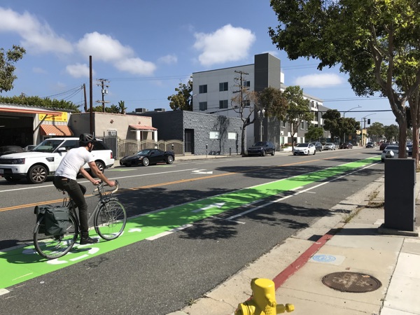 The City of Santa Monica is nearly finished painting 19 miles of green bike lanes throughout the city to improve bike safety, encourage solo drivers to trade their cars for alternative modes of transit and better link the City’s bike network to the Metro light rail.