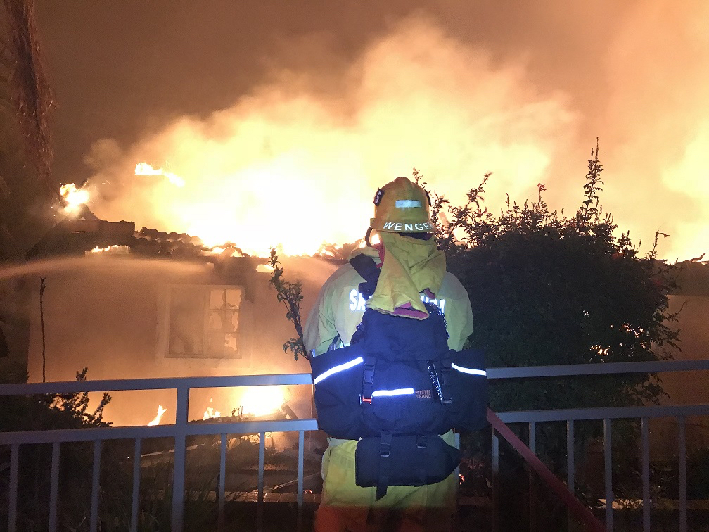 Zachary Mendoza battling to save a home in Ventura during his first night on the job as a Santa Monica Firefighter