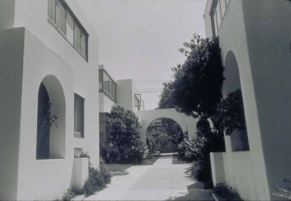 This is one of the finest remaining examples of architect Irving Gill’s work in the field of social housing, as it shows Gill’s interest in designing affordable alternatives to the single-family home. Gill used the courtyard as a transitional space between the street and the building interiors, and the configuration exemplifies the bungalow court typology. Gill’s work was influenced by the region’s Spanish Colonial Revival and Mission Revival styles. Abstracting elements of these styles, his designs were modern interpretations of these more traditional forms. In doing so, Gill became a pivotal figure in California Modernism. The court was restored in the 1970s. Horatio West Court has been recognized on the National Register of Historic Places since 1977.