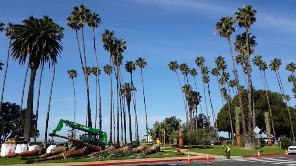 Caption: One of Palisades Park’s new California fan palms. All palms will be untied by the end of June.