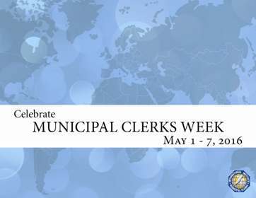 A Proclamation, issued by the Santa Monica City Council, on April 12, 2016 resolves that the week of May 1-7, 2016 is designated as "Municipal Clerks Week."