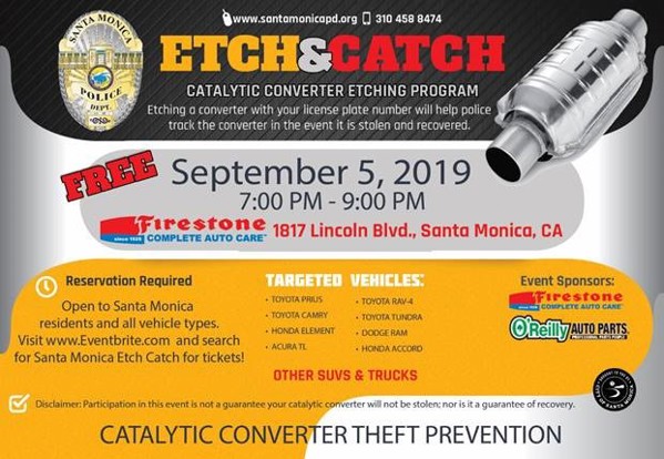 The Santa Monica Police Department is partnering with local businesses to host a FREE catalytic converter etching event where vehicle license plate numbers will be etched onto the heat shield of catalytic converters.