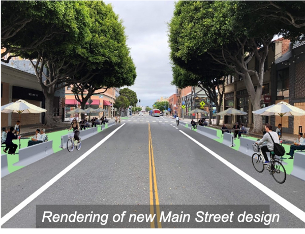 The reimagined Main Street from Pico Boulevard to Pier Avenue temporarily leverages space previously dedicated to street parking and the center turn lane to expand the space businesses and customers can safely use. The features will include: