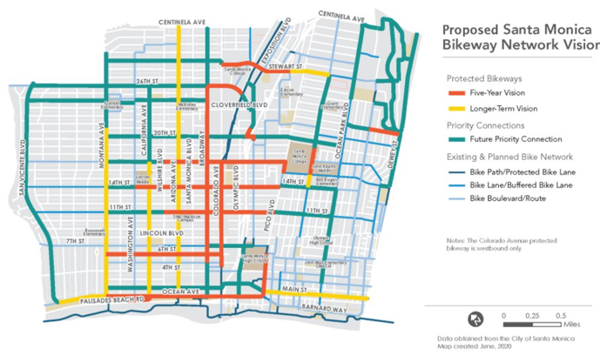 Last night, the Santa Monica City Council unanimously approved a five-year plan and longer-term strategy to enhance bike safety by creating a network of protected bike lanes in Santa Monica through an update to the 2011 Bike Action Plan. This is part of the City’s commitment to multi-modal and carbon light living, reducing roadway fatalities through Vision Zero, and spurring economic recovery by connecting people to commercial districts and facilitating quick trips and deliveries to local businesses.