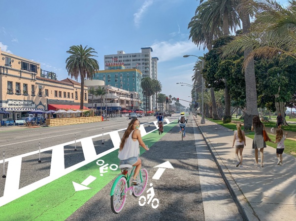Starting next month, Ocean Avenue will start to look different with new amenities that reflect the local flavor of Santa Monica – a protected bike lane on the west side of the street and an expanded pedestrian “boardwalk” to accommodate outdoor dining. The investments are a coordinated effort that advance the City’s mobility and economic recovery goals to create safe and vibrant public spaces.